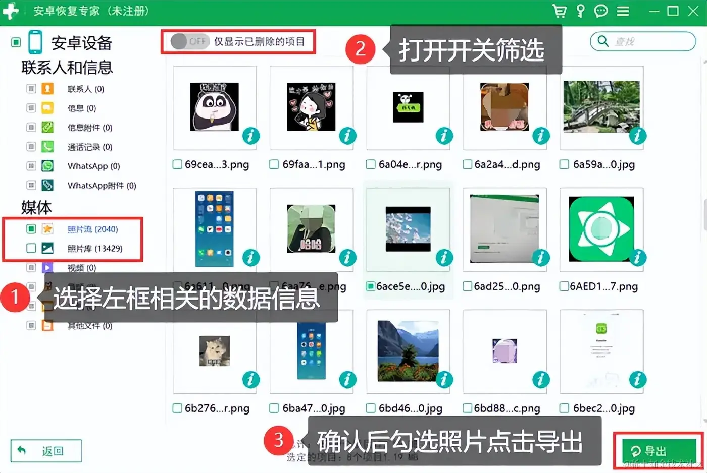 步骤3:在扫描结果页面可以搜索照片信息,也可以打开 【仅显示已删除项目】 的开关,方便恢复照片。预览照片并确认后可以勾选然后点击右下角的【导出】键开始恢复到手机相册中。
