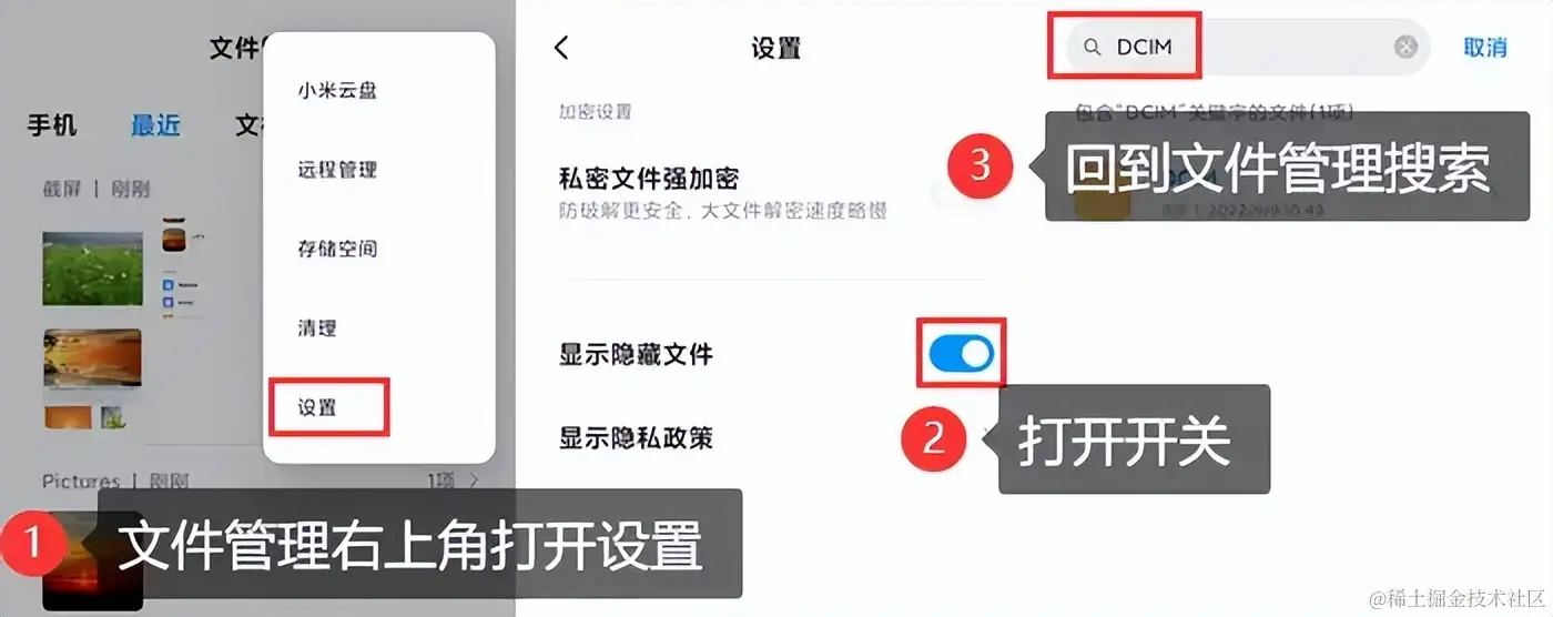 步骤2:找到文件管理中的 【设置】 ,进入打开 【显示隐藏文件】 的开关,再回到文件管理首页,搜索 【DCIM】 ,进入查看有无需要恢复的照片即可。