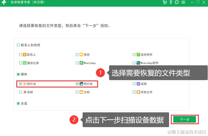 步骤2:选择需要恢复的文件类型 【照片流】 和 【照片库】 ,然后点击下一步等待软件扫描手机内的照片数据。
