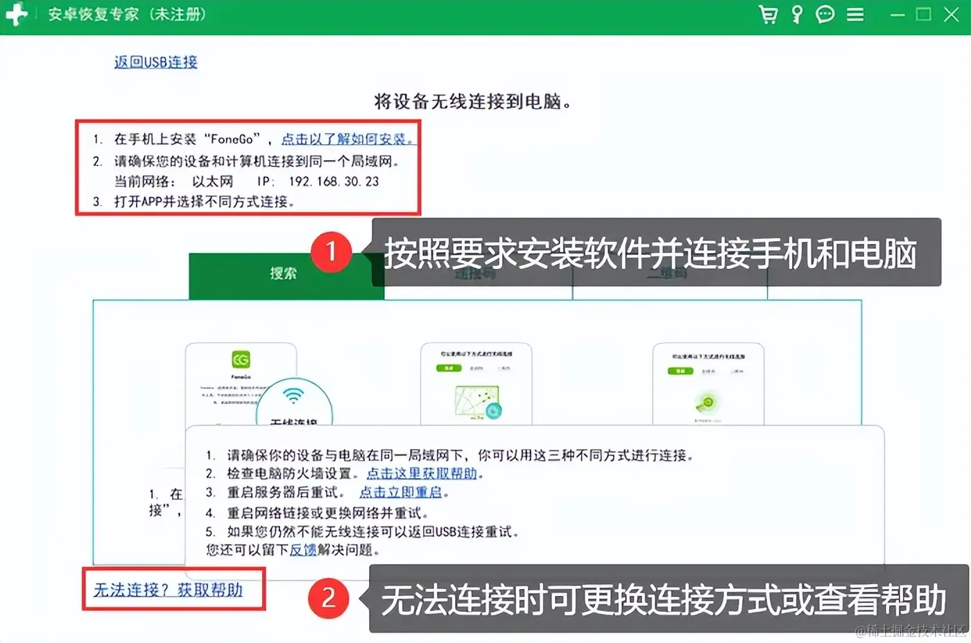 步骤1:需要在电脑上下载安装该软件,安装完成后根据提示在手机上安装相应程序,然后开始连接需要恢复照片的手机和电脑。