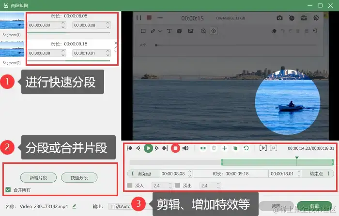 步骤4:录制完成之后,预览视频或者在 【高级剪辑】 页面,您可以剪辑视频、给视频添加特效、还可以对视频进行快速分段,接着点击 “完成” 按钮结束此次录制。