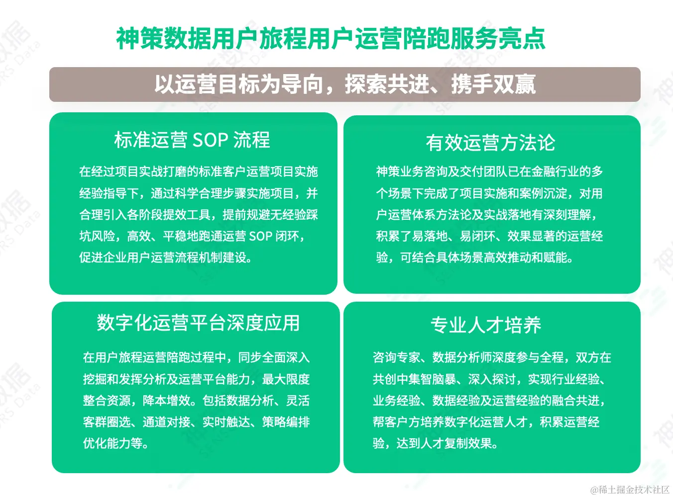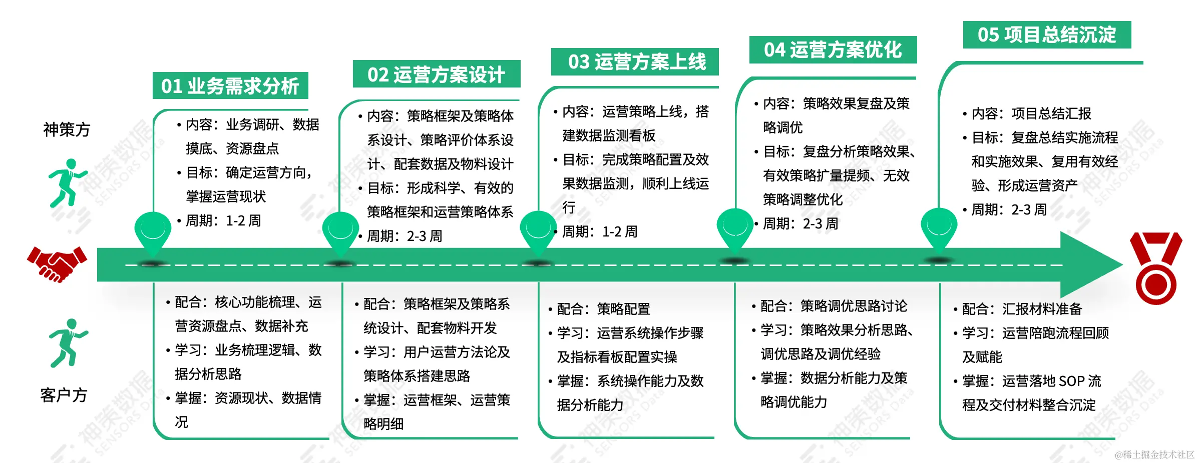 神策数据所提供的全生命周期的客户旅程编排,通过平台 + 服务的方式,驱动数字化客户运营目标快速达成。具体实施内容包括: