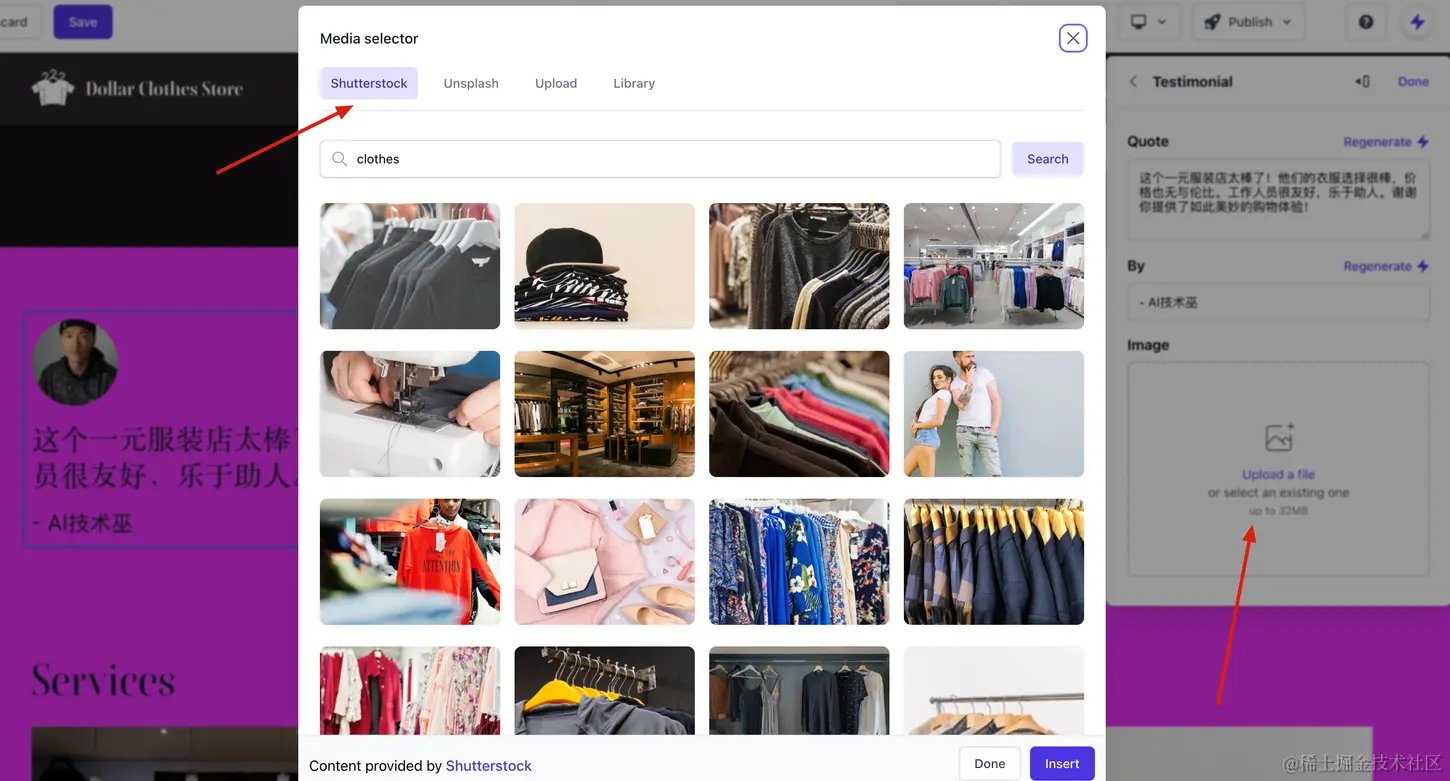 它在给我设计的网站页面中,还包含了一个评论展示的功能,让我觉得更惊艳和贴心的是选择图片的时候还有多种渠道可以选择,而且展示的图片也都是比较贴合主题的