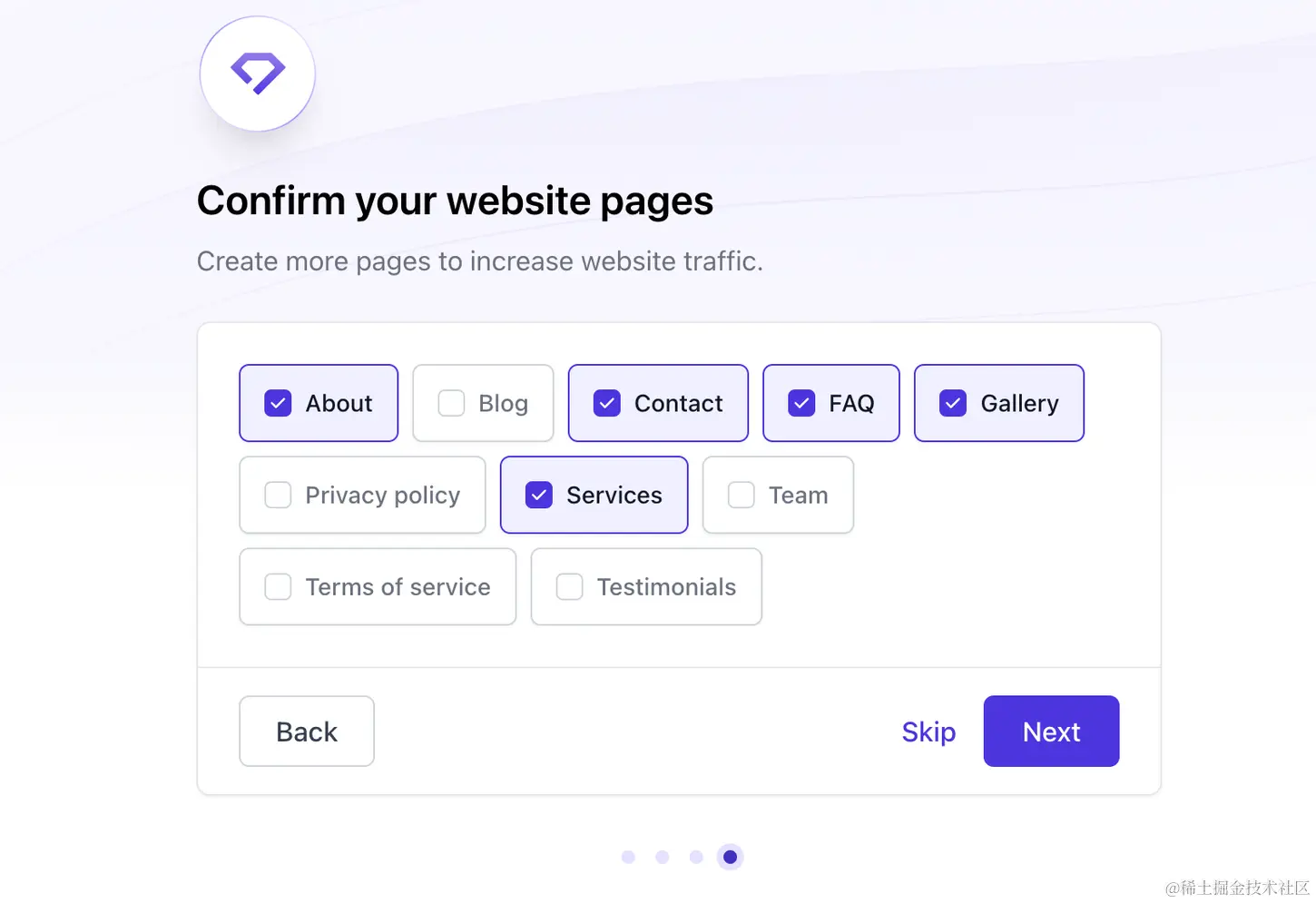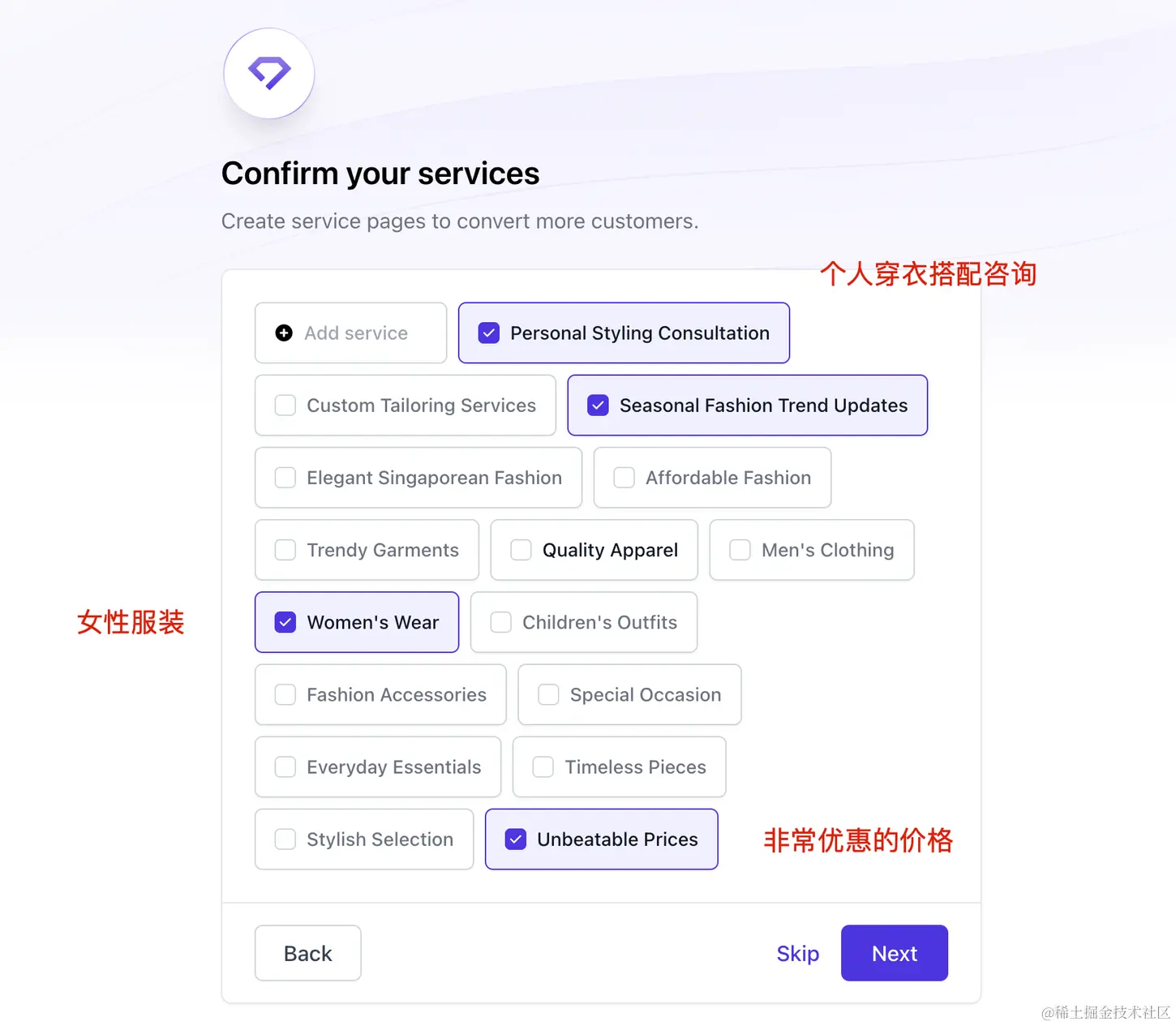 第三步是确认你的服务内容,这个比较重要,是后面生成网站的一个参考(因为生成的网站有一个部分就是介绍你的服务)
