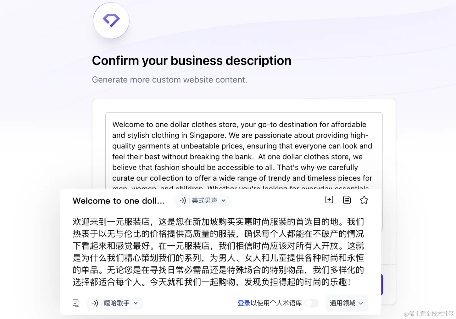 第二步就是确认你的网站描述,这一步是Durable利用AI自动生成的,看起来还是蛮贴合的,所以就没改了