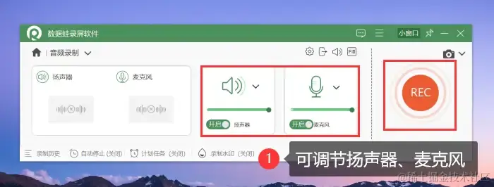 步骤3:录制电脑上的音频会议、音乐等,需要开启扬声器;录制电脑外部的声音,需要开启麦克风。可根据您的需求进行调节。按 【REC】 开始即可进入音频录制。