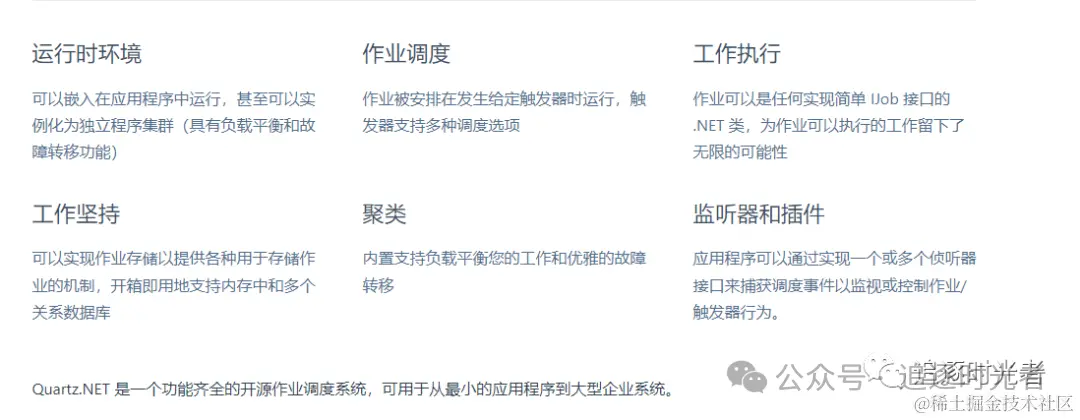 一款功能齐全的任务调度系统,从小型应用到大型企业级系统都能适用。功能齐全体现在触发器的多样性上面,即支持简单的定时器,也支持Cron表达式;即能执行重复的作业任务,也支持指定例外的日历;任务也可以是多样性的,只要继承IJob接口即可。