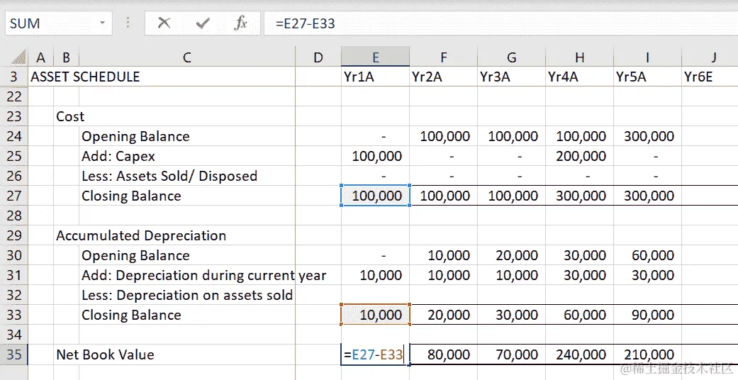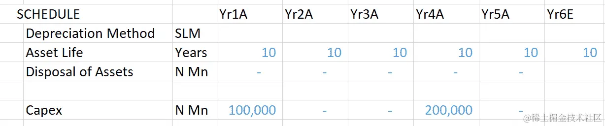 每年的总折旧费用是该年各行(第11-20行)所有折旧的总和。对于Yr1A,这将是E列中第11-20行的所有折旧的总和;对于Yr2A,这将是F列中第11-20行的所有折旧的总和。在我们的示例中,只有Yr1A和Yr4A在年度内有Capex的增加,如下截图所示: