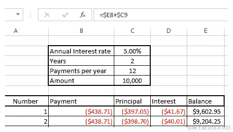 E8,其中包含初始余额金额。在这样做时,请确保不锁定列。我们第二个余额字段的公式现在如下所示: