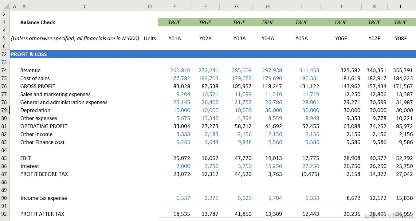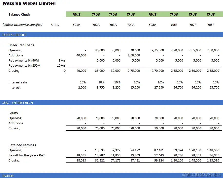 在我们的示例中,有一笔金额为 N40 百万的贷款在Yr1A提取,利率为 10%,分 8 年还清;另一笔金额为 N250 百万的贷款在Yr4A提取,利率也为 10%,分 10 年还清。N40 百万的贷款从Yr2A到Yr9E分 8 年还清。N250 百万的贷款在Yr5A开始还款,将继续 9 年。