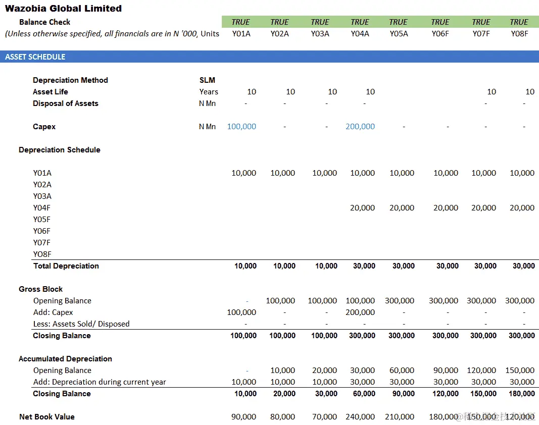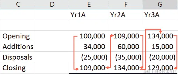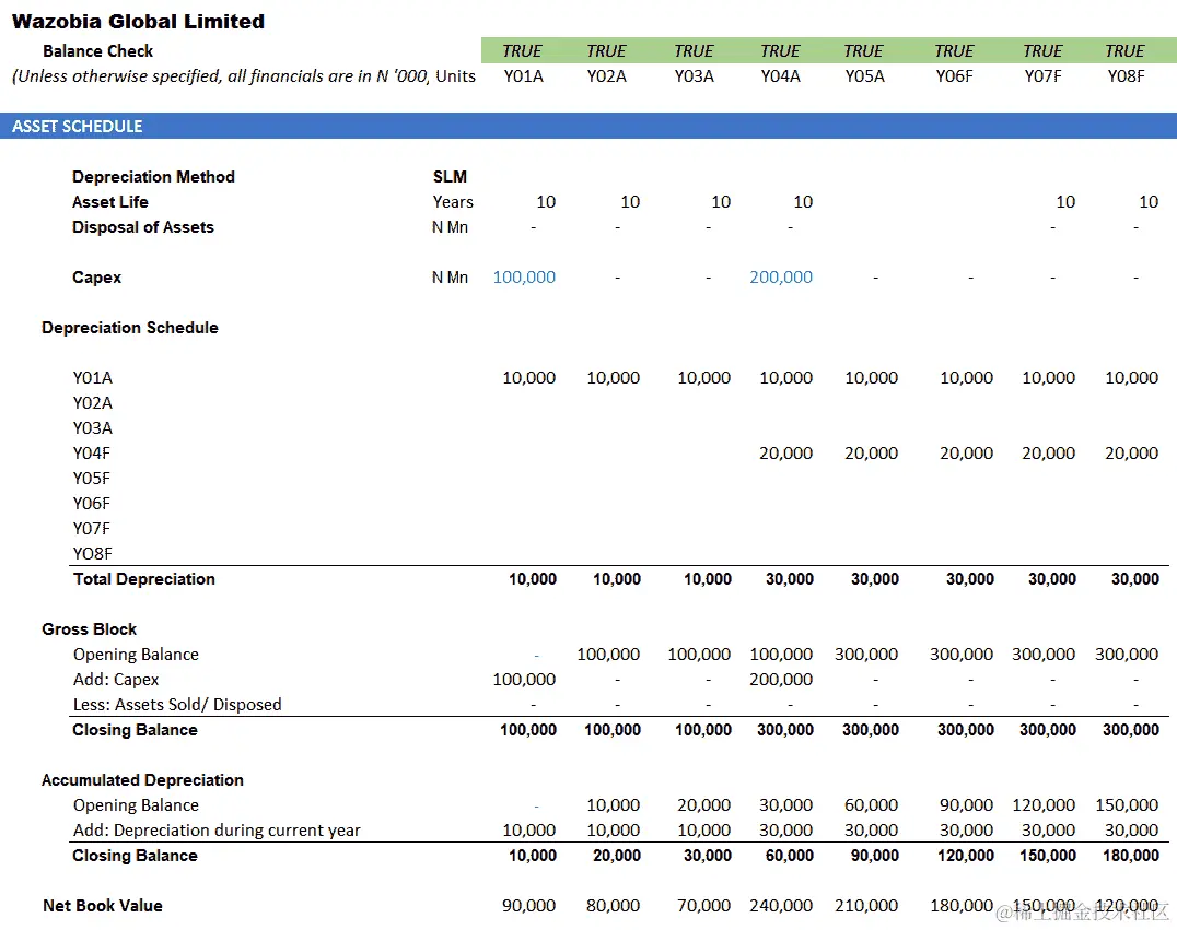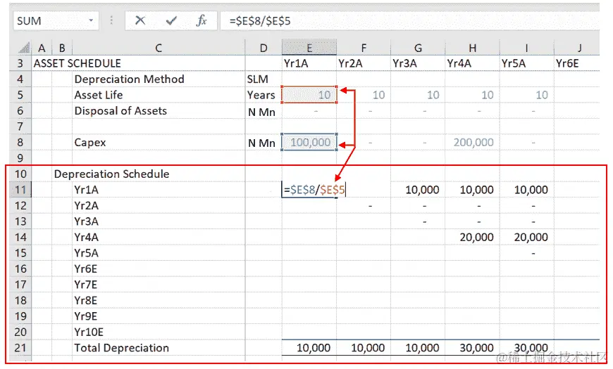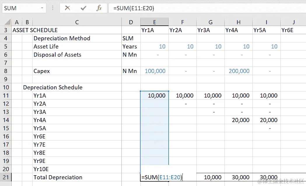 固定资产的折旧在11-20行和E-N列之间。固定资产增加的年度折旧费用是当年的 CapEx 除以资产寿命。对于Yr1A,这是E8除以E5,即10,000,如前面的截图所示。Yr1A增加的折旧费用从E****11行开始,在第 11 行每年继续为10,000,如下截图所示: