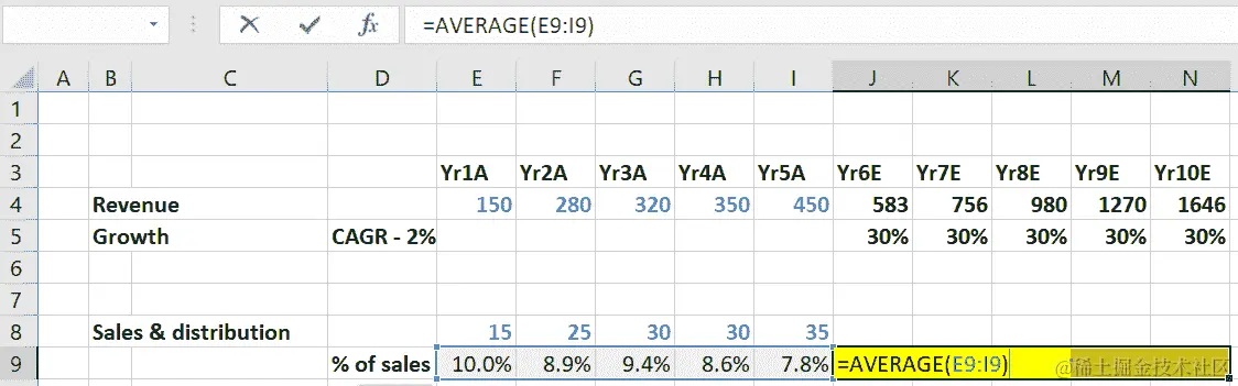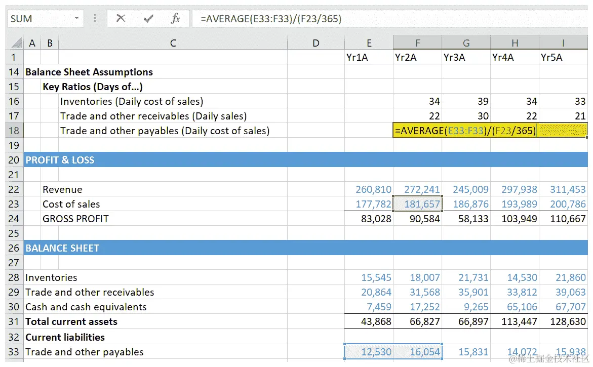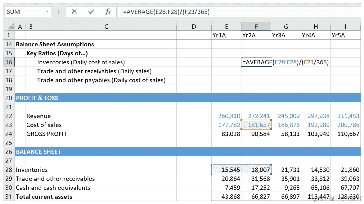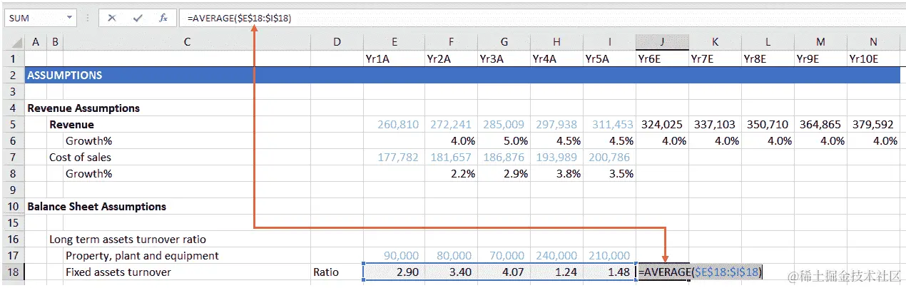 我们将计算Yr1A-Yr5A历史固定资产周转率的平均值,然后将这个平均值作为未来五年的预测驱动因素。以下截图说明了历史固定资产周转率平均值的计算: