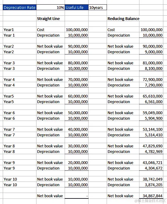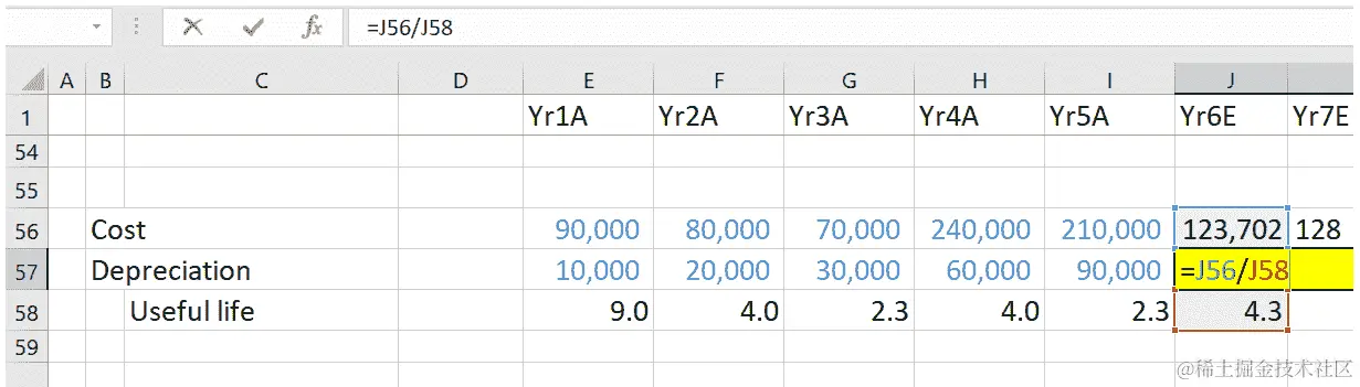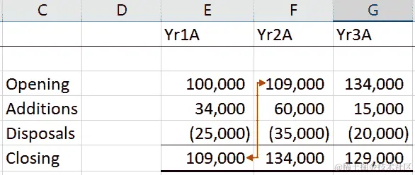 Yr2A的增加折旧按F8除以F5计算,将从第 12 行开始每年计提 10 年,即F****12行之下的下一行开始。同样,Yr3A的增加折旧将从G****13行开始,将在第 13 行沿着 10 年计提。