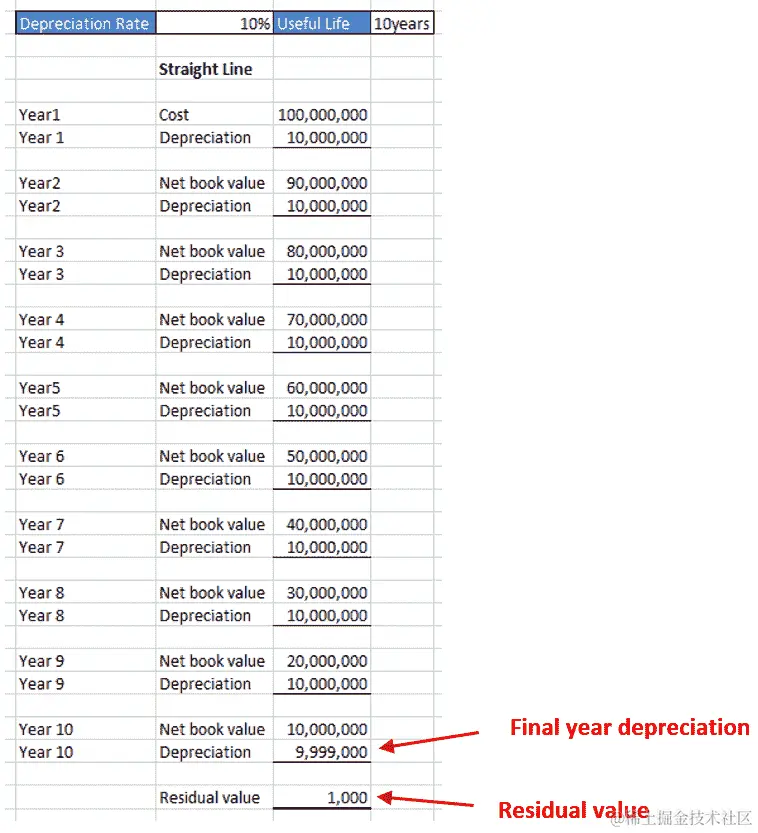 使用寿命值输入以下方程中,以得出年度的折旧费用:
