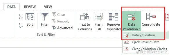 每年支付字段中。为此,转到 数据 选项卡,然后在那里选择 数据验证 选项: