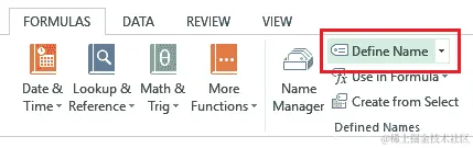 - 现在,我们需要将这个表转换成一个列表。我们将通过转到 公式 选项卡并选择 定义名称 选项来完成这个操作,如下所示: