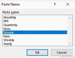 - 现在,在 源: 输入框中,按下键盘上的 F3 键以打开 粘贴名称 弹出窗口。这里你会找到你的列表名称,如下所示: