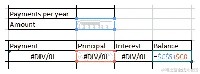 现在我们已经准备好了模板,是时候用 Excel 施展魔法,为贷款中的不同变量创建计算公式了,比如本金、利息、总支付金额和支付后的余额。如果我们试图输入用于计算每个值的实际公式,那么这些公式将变得过于复杂。幸运的是,Excel 已经让我们可以借助内置函数(如 PMT、PPMT 和 IPMT)轻松计算这些值。我们将使用这些函数来计算我们的贷款,以下是我们的步骤: