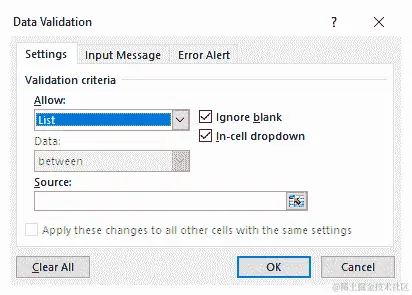 - 选择好列表名称后点击 确定,它应该会出现在 源: 输入框中。现在,在 数据验证 窗口中点击 确定,咦,下拉菜单已经在