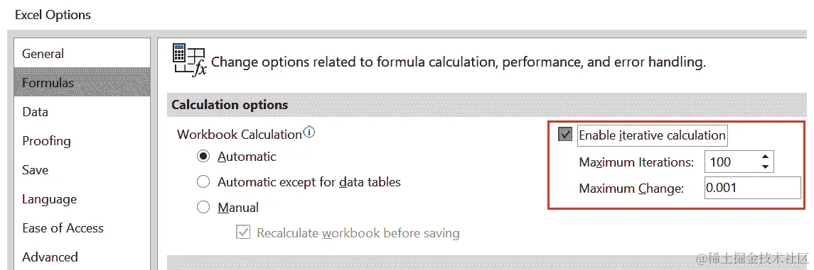 为了让这种情况发生而不被 Excel 视为错误,您需要在 Excel 选项>公式下启用迭代计算。以下屏幕截图演示了如何启用迭代计算: