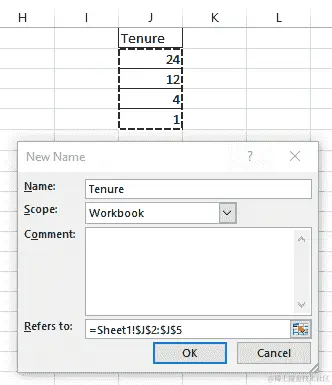 Tenure。在 引用: 输入框中,我们将输入表格所在的单元格数组,本例中为$J$2:$J$5: