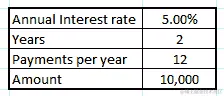 假设一位客户已经接洽您,并要求借款$10,000,期限为 2 年。根据公司政策,您必须按年利率 5%收取利息。此外,客户想要选择月付款方式。让我们为他们计算贷款,使用以下步骤: