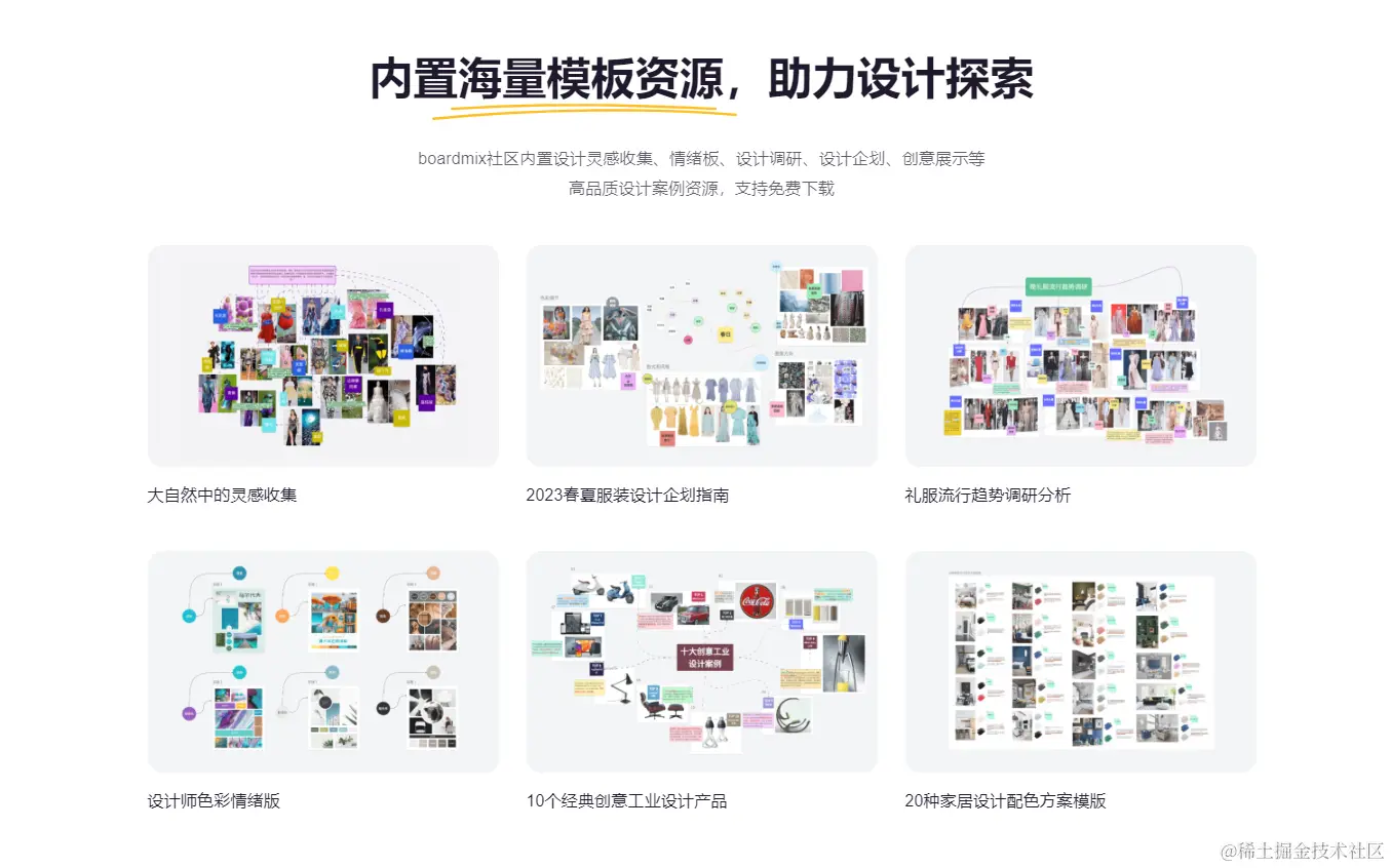 海量模板资源:boardmix 模板社区内置设计灵感收集、情绪板、设计调研等模板资源,支持免费下载。