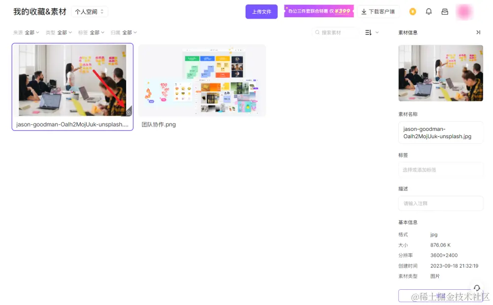 在选中图片的情况下,右侧的面板会显示素材的诸多信息,包括图片名称、标签、描述、格式、图片大小、分辨率、创建时间、素材类型。