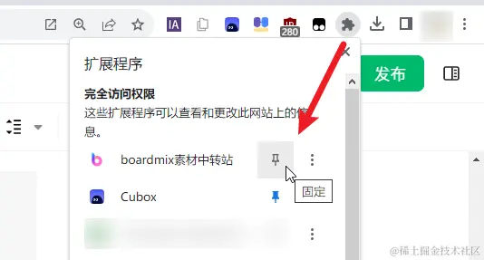 安装 boardmix 素材库插件之后,点击浏览器右上角的「插件」图标,将 boardmix 插件固定在浏览器的右上角方便使用。