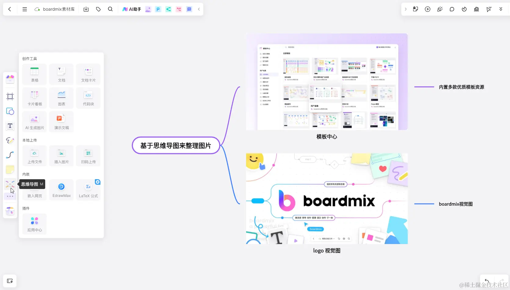 将素材库的图片或文本插入 boardmix 画布后,我们可以使用内置的可视化工具来组织和呈现这些内容,譬如点击 boardmix 左侧工具栏的「思维导图」,在画布上插入思维导图,基于思维导图来整理图片,让相关的内容关联整合到一起。