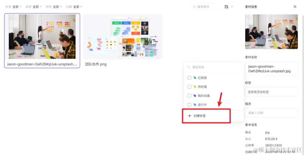 另外,右击素材库的图片,点击浮窗的「标签」选项,也能给图片快速添加标签。