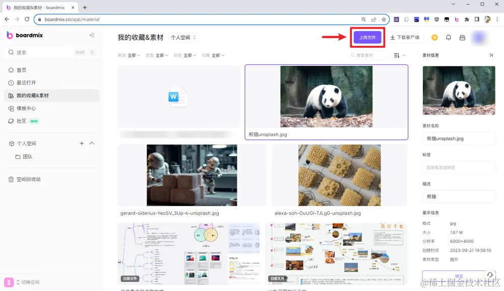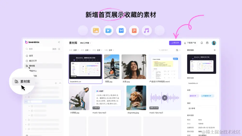 除了通过浏览器插件剪藏内容,boardmix 素材库还支持导入电脑本地的多种文件,包含图片、视频、音频、Word、Excel、PDF 等。点击 boardmix 素材库右上角的「上传文件」按钮,即可将文件快速导入素材库中。