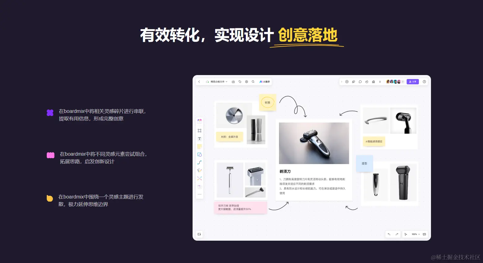 创意落地:在 boardmix 中串联灵感碎片,提取有用信息,形成完整创意,并尝试不同组合以启发创新设计。