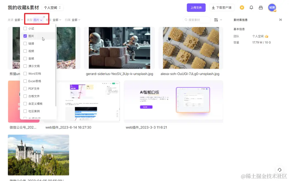boardmix 素材库支持上传多种文件类型,不局限于图片,但如果我们只想查看保存到素材库中的图片,可以点击素材库左上角「类型」右侧的下拉箭头,在弹出的浮窗,勾选「图片」,就能筛选出素材库中的所有图片。