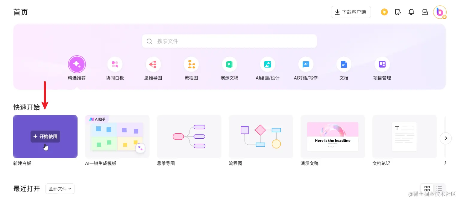 在浏览器打开 boardmix 首页,点击「新建白板」,创建一个 boardmix 文件。