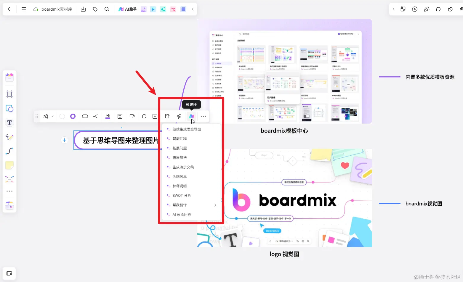 此外,选中任意一个思维导图节点时,我们还可以调用 boardmix 集成的「AI 助手」,可用于继续生成思维导图、智能注释、拓展问题、拓展想法、生成演示文稿、头脑风暴、解释说明、SWOT 分析、帮我翻译、AI 智能问答,让 AI 辅助我们生成各种创意,让灵感不受限!