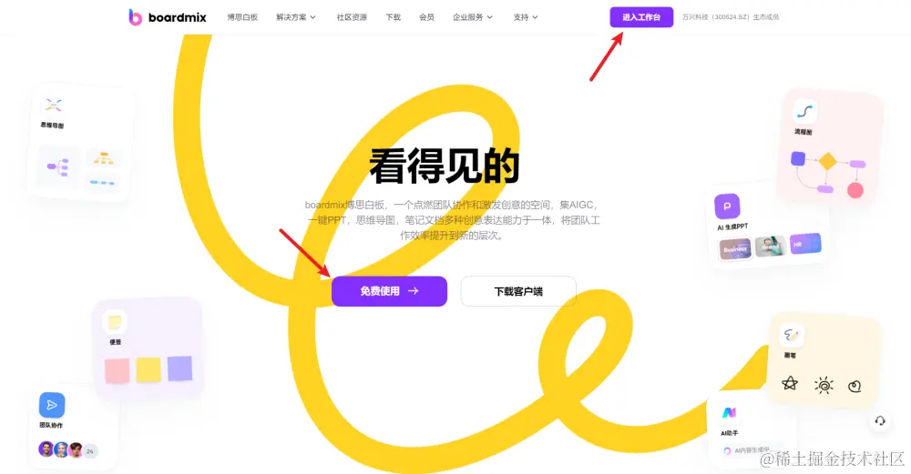在浏览器打开 boardmix 博思白板的首页,点击中间的「免费使用」按钮,进入 boardmix 的工作台页面。