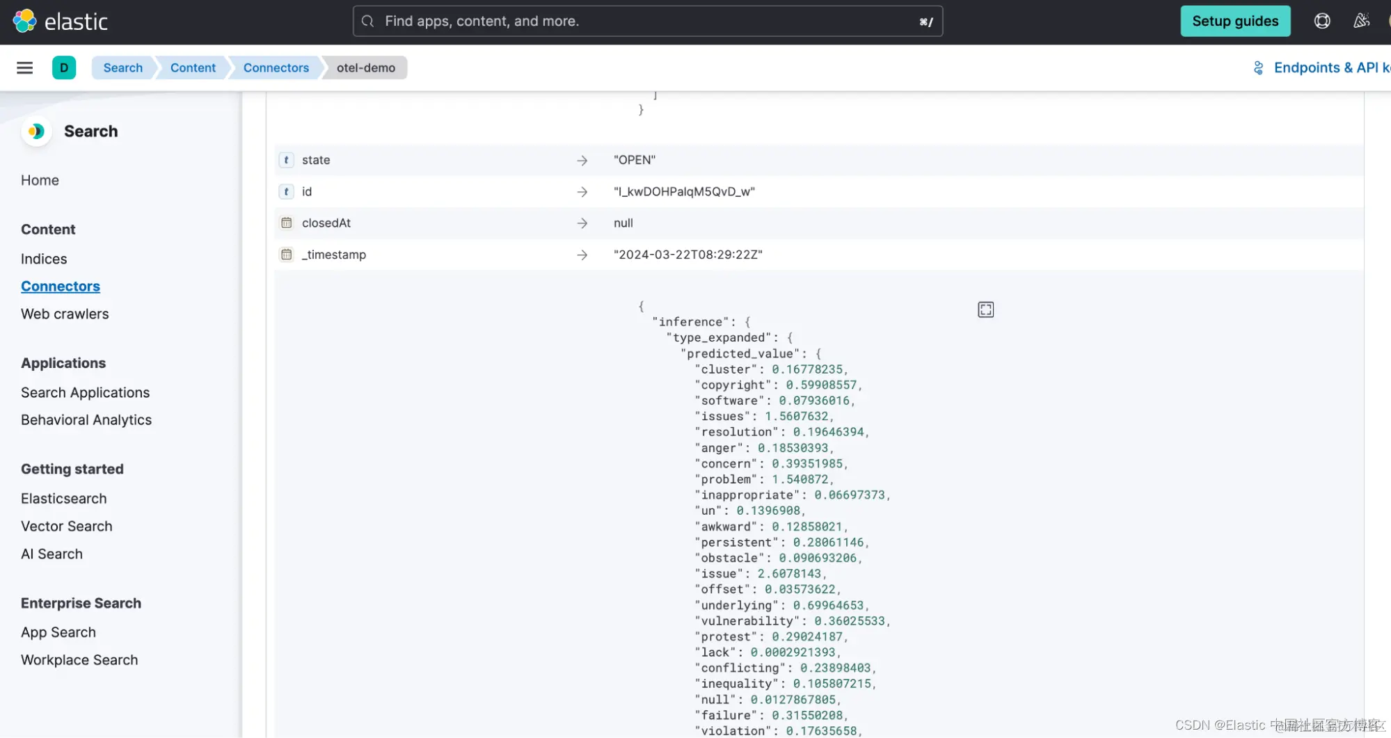 - 当数据从 GitHub 存储库传入时,ELSER 会应用于数据,并添加嵌入(稀疏向量场中的权重和 tokens)以捕获数据的语义和上下文。
