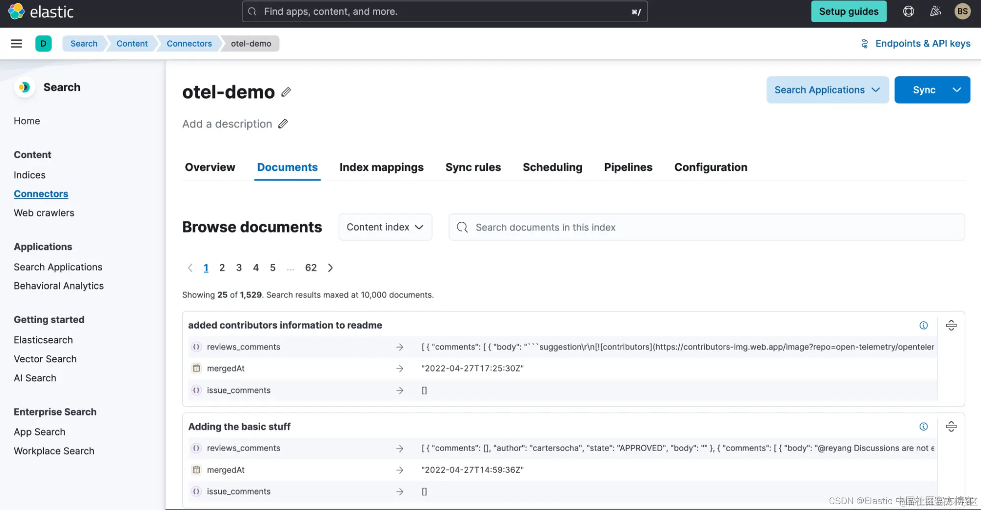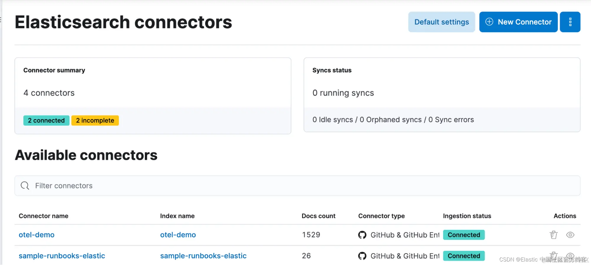 我们最初使用 Elastic GitHub 连接器连接到 GitHub,并提取和处理两个存储库:OpenTelemetry 演示存储库(公共)和内部 Runbook 存储库(Elastic 内部)。