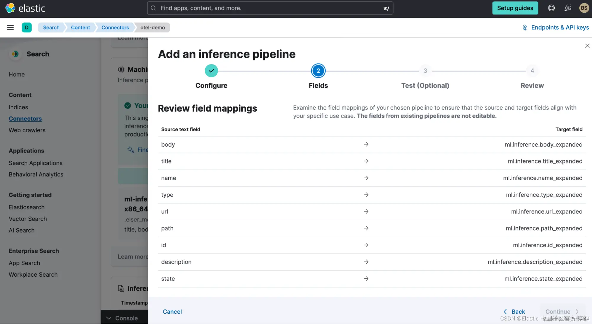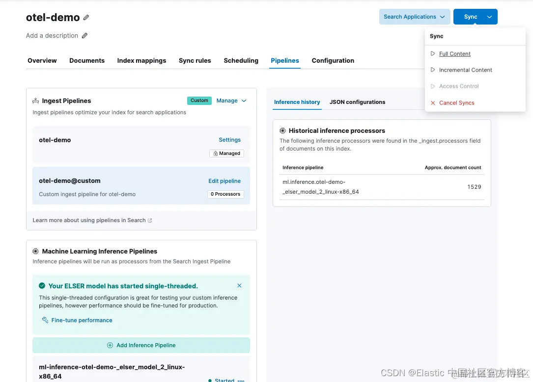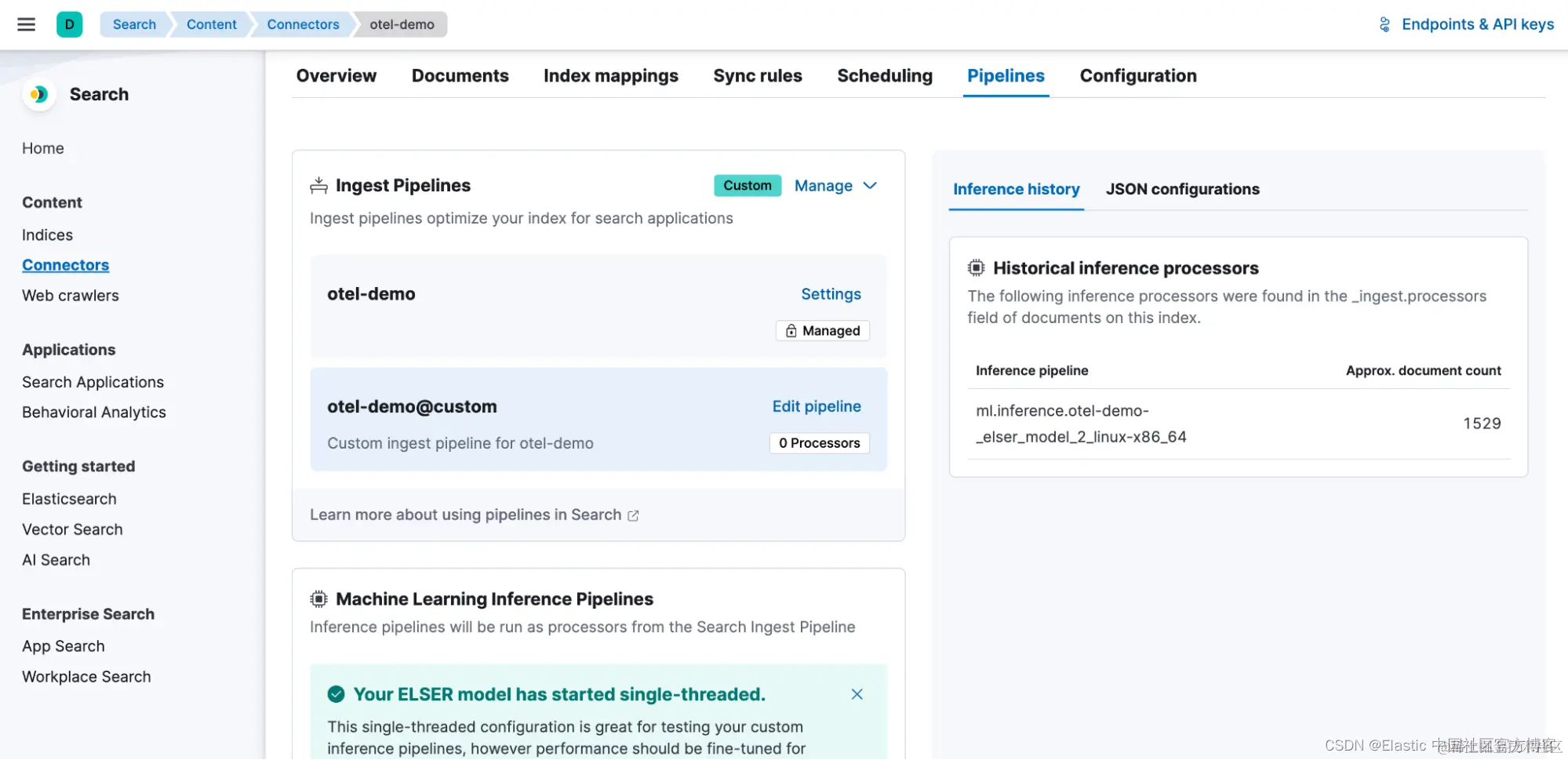 - 将包含代码和问题的外部 GitHub 存储库(OpenTelemetry 演示存储库)提取到 Elastic 中。 应用 Elastic Learned Sparse EncodeR (ELSER) 并将其存储在 AI 助手的特定索引中。