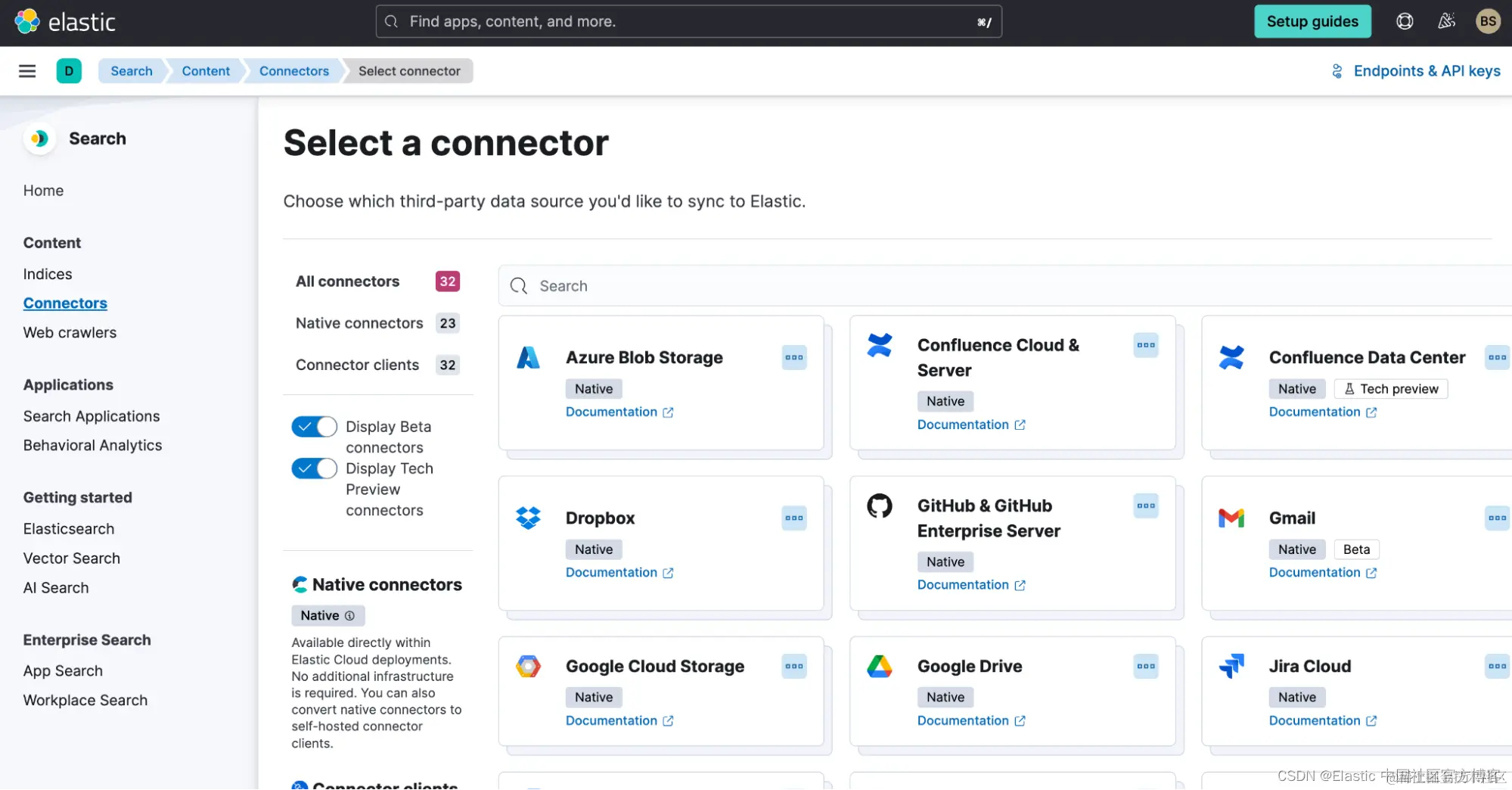 第一步是设置 GitHub 连接器并连接到你的 GitHub 存储库。 Elastic 拥有来自 GitHub、Confluence、Google Drive、Jira、AWS S3、Microsoft Teams、Slack 等的多个连接器。 因此,虽然我们将在本博客中介绍 GitHub 连接器,但不要忘记其他连接器。