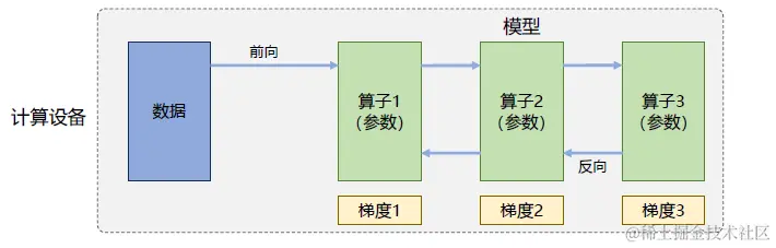 计算图的执行过程可以分为前向计算和反向计算两个阶段。前向计算的过程是将数据读入第一个算子,计算出相应的输出结构,然后依此重复这个前向计算过程,直到最后一个算子结束。反向计算过程,是根据优化函数和损失,每个算子依次计算出梯度,并利用梯度更新本地的参数。在反向计算结束后,该数据小批次的计算完成,系统就会读取下一个数据小批次,继续下一轮的模型参数更新。