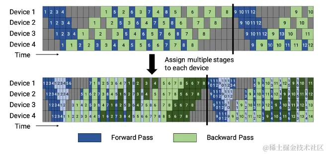 1F1B 交错式调度模式要求micro-batch 的数量是流水线阶段的整数倍。每个设备不再仅负责连续多个层的计算,而是可以处理多个层的子集,这些子集被称为模型块。具体而言,在之前的模式中,设备1 可能负责层1-4,设备2 负责层5-8,以此类推。然而,在新的模式下,设备1 可以处理层1、2、9、10,设备2 处理层3、4、11、12,以此类推。这种模式下,每个设备在流水线中被分配到多个阶段。例如,设备1 可能参与热身阶段、前向计算阶段和后向计算阶段的某些子集任务。每个设备可以并行执行不同阶段的计算任务,从而更好地利用流水线并行的优势。这种模式不仅在内存消耗方面表现出色,还能够提高计算效率,使得大型模型的并行系统能够更高效地完成计算任务。