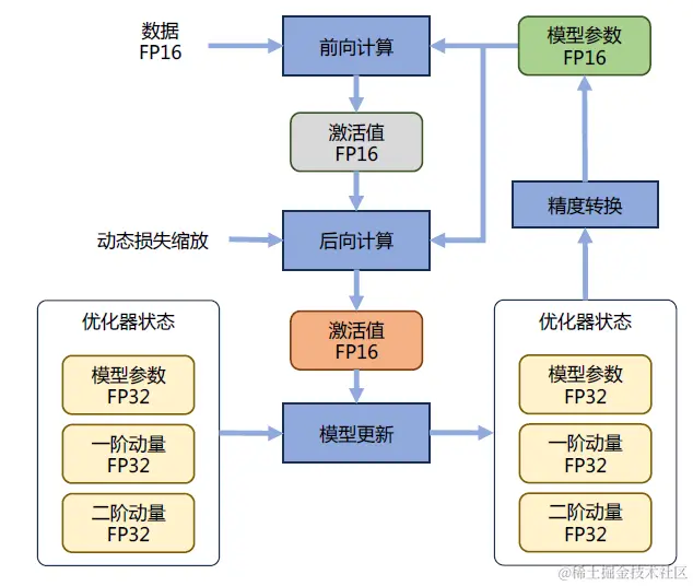 其中Adam 状态占比75%。动态损失缩放反向传播前,将损失变化(dLoss)手动增大2K 倍,因此反向传播时得到的激活函数梯度则不会溢出;反向传播后,将权重梯度缩小2K 倍,恢复正常值。举例来说,对于包含75 亿个参数模型,如果用FP16 格式,只需要15GB 计算设备内存,但是在训练阶段模型状态实际上需要耗费120GB。