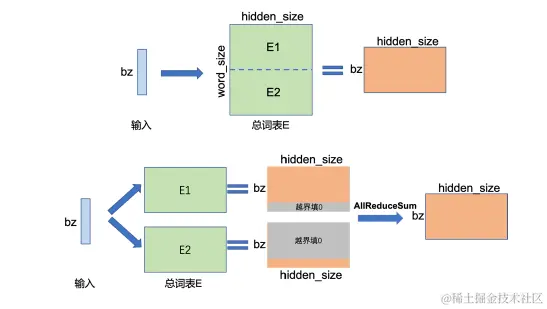 在单节点上,执行Embedding 操作,bz 是批次大小(batch size),Embedding 的参数大小为[word_size, hidden_size],计算得到[bz,hidden_size] 张量。图4.9中Embedding 张量并行示例将Embedding 参数沿word_size 维度,切分为两块,每块大小为[word_size/2, hidden_size],分别存储在两个设备上。当每个节点查询各自的词表时,如果无法查到,则该词的表示为0,各自设备查询后得到[bz, hidden_size] 结果张量,最后通过AllReduce_Sum 通信¬,跨设备求和,得到完整的全量结果,可以看出,这里的输出结果和单计算设备执行的结果一致。