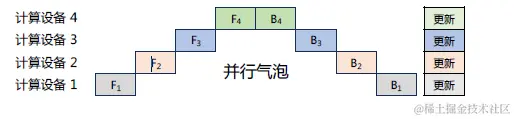 这种情况导致了设备的平均使用率大幅降低,形成了模型并行气泡(Model Parallelism Bubble),也称为流水线气泡(Pipeline Bubble)。