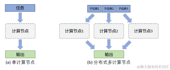 分布式训练(Distributed Training)是指将机器学习或深度学习模型训练任务分解成多个子任务,并在多个计算设备上并行地进行训练。图1给出了单个计算设备和多个计算设备的示例,这里计算设备可以是中央处理器(Central Processing Unit,CPU)、图形处理器(Graphics Processing Unit,GPU)、张量处理器(Tensor Processing Unit,TPU)也可以是神经网络处理器(Neural network Processing Unit,NPU)。