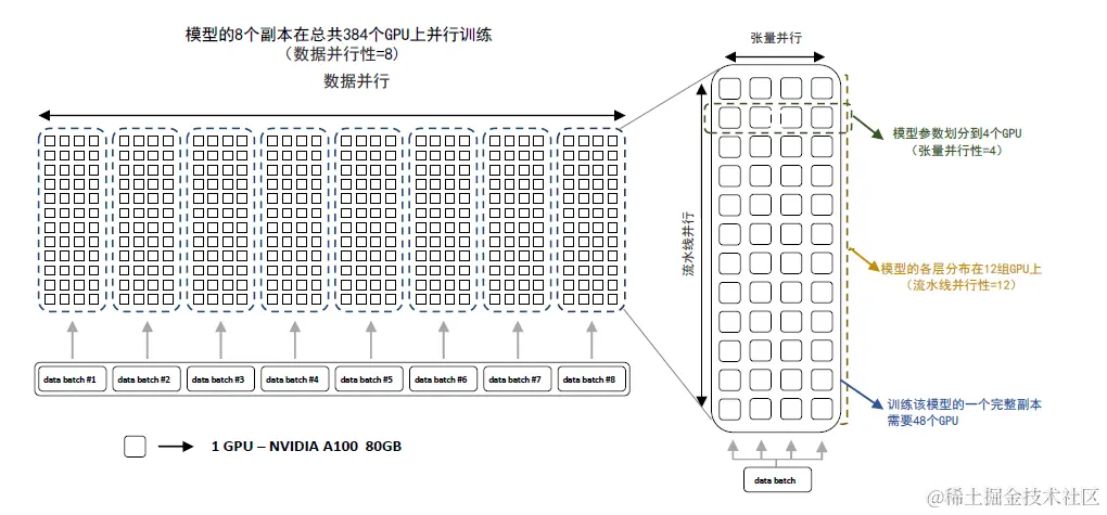 BLOOM 模型训练使用了由48 个NVIDIA DGX-A100 服务器组成的集群,每个DGX-A100 服务器包含8 张NVIDIA A100 80GB GPU,总计包含384 张。BLOOM 训练采用的策略是首先将集群分为48 个一组,进行数据并行。