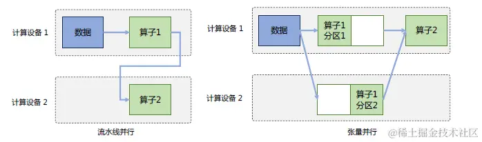 两节点模型并行训练系统样例如图4.9所示,左边为流水线并行,模型的不同层被切分到不同的设备中;右边为张量并行,同一个层中的不同的参数被切分到不同的设备中进行计算。