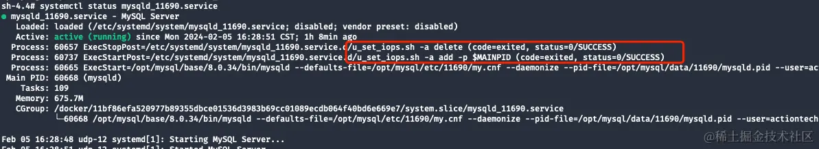 start命令 hang 住时,检查mysqld.pid文件,一旦文件被创建后,立刻执行sudo -S kill -9 $(cat /opt/mysql/data/11690/mysqld.pid)。 - 此时观察 systemctl status,表现与预期一致